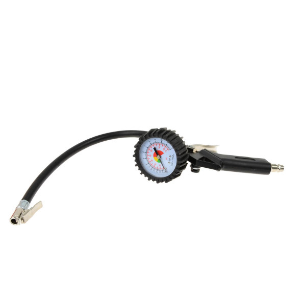 Професійний пневматичний пістолет з манометром - для накачування шин легкових та вантажних автомобілів. Оснащений гнучким шлангом 37 см та великим, легкочитаним манометром у гумовому чохлі, що захищає від ударів та поштовхів. Шкала вимірювання у двох одиницях - Psi та Bar. Швидкороз'єм 1/4" дозволяє швидко підключитися до компресора.